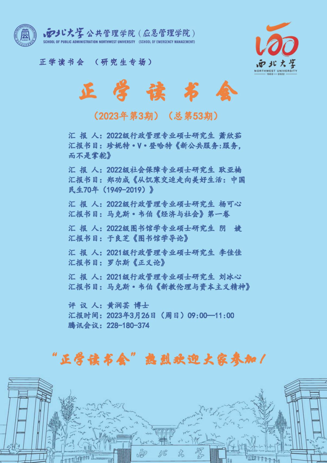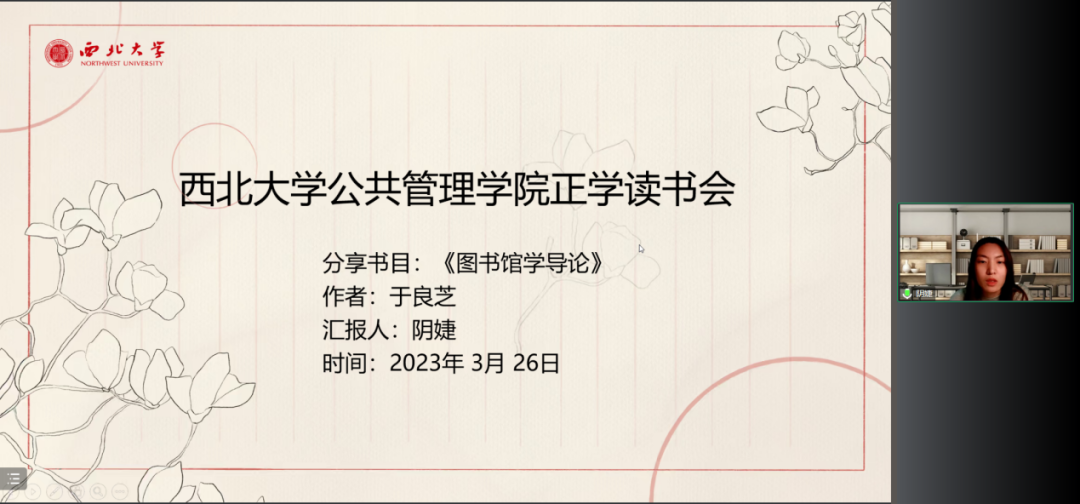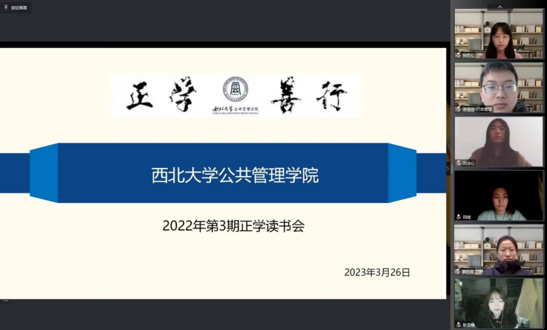 2023年3月26日上午,我院线上举办了2023年第3期正学读书会。2022级行政管理专业硕士研究生萧欣茹、2022级行政管理专业硕士研究生杨可心、2022级社会保障专业硕士研究生耿亚楠、2022级图书馆学专业硕士研究生阴婕、2021级行政管理专业硕士研究生李佳佳、2021级行政管理专业硕士研究生刘冰心分别作为主讲人进行读书汇报,公共管理学院博士研究生黄润芸担任评议人,部分研究生旁听了此次报告会。