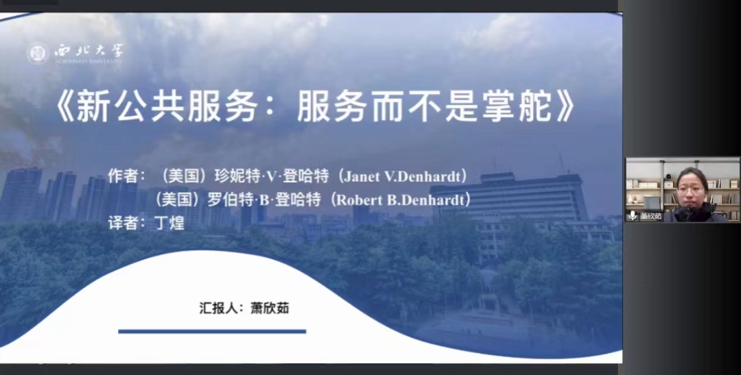2022级行政管理专业硕士研究生萧欣茹分享的书籍为《新公共服务:服务而不是掌舵》,她从作者简介、写作背景及基本概述、结构安排、主要内容和观点、主要评论这五个方面展开讲解。首先她从老公共行政与新公共管理的特点及主张的介绍入手,引入了这场争论。接着她从民主公民权理论、社区与公民社会理论、组织人本主义和新公共行政、后现代公共行政四个方面介绍新公共服务理论产生的理论来源。最后她分别论述了本书作者主张的新公共服务理论的7个基本观点,包括服务于公民而不是服务于顾客、追求公共利益、重视公民权胜过企业家精神等。