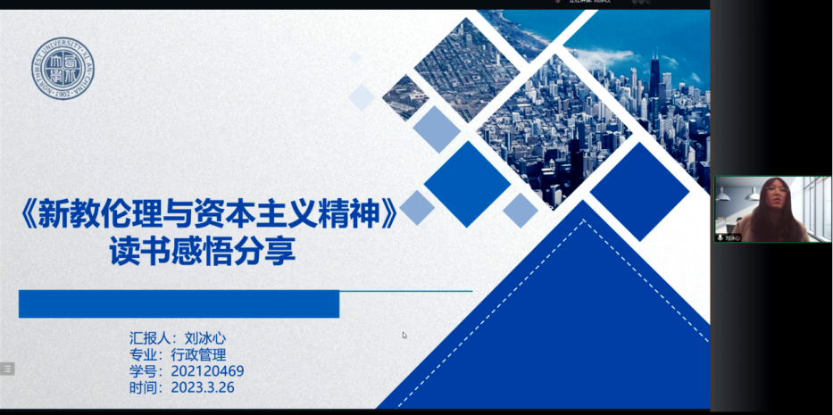 2021级行政管理专业硕士研究生刘冰心分享的书籍为《新教伦理与资本主义精神》,她从作者简介、写作逻辑框架、案例分析三个方面展开了讲解。首先她对马克斯·韦伯的学术成就进行了简单介绍。其次她以脉络图的方式详细讲解了全书的三部分内容。最后通过基督城恐怖袭击的案例回应并延伸讲解了种族主义的相关概念与实际弊端。