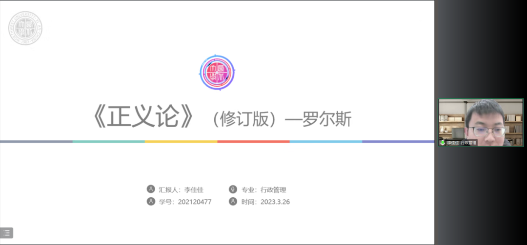 2021级行政管理专业硕士研究生李佳佳分享的书籍为罗尔斯的《正义论》,他从作者简介、写作背景、逻辑思路与框架、主要内容与观点以及批判与回应等五个方面展开讲解,主要介绍了何谓正义、正义的对象以及作为公平的正当等概念,同时通过分析原初状态和“无知之幕”的内在含义,探究了正义论的两个原则,即“平等的自由”原则和“民主的平等”原则,最后指出了其他学者对于正义论的一些批判以及罗尔斯对于这些批判的相关回应。