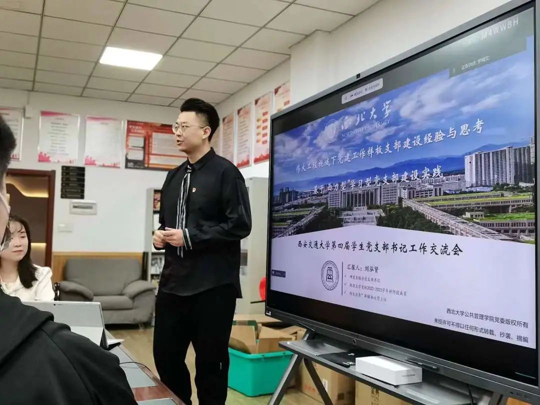 会议邀请了清华大学、西安交通大学、哈尔滨工业大学、西北大学等高校的学生党支部书记参会。主题发言环节,刘泓贤同志作了题为《伟大工程视域下党建工作样板支部建设经验与思考——基于“四力型”学习型党支部建设实践》的报告。刘泓贤同志以丰富的时政热点为引,尤以国民党党建和苏共党建作为反面例证,指出公共价值和意识形态领域是没有硝烟的战场,作为革命者的我们,革命“狂飙”的任务远未结束。立足开展党建工作的原旨要义《共产党宣言》,历届党和国家领导人以实践探索深化党的建设理论阐释,充分证明全方位加强党的建设是一项凝聚共识的“伟大工程”。立身为正,明道善策。刘泓贤同志以自己4年来从事党建工作的经历,努力对标、力行诠释“政治上的明白人、党建工作的内行人、干部职工的贴心人”的要求和标准。专业共融,互促共进。刘泓贤同志详细介绍了研究生联合党支部的基本情况,基于“党建+专业”视角,阐释了应急管理、图书馆学、档案学、应用心理学、教育经济与管理等5大专业如何实现“互促共进”,同时介绍了研究生联合党支部组织架构,指出抓好党支部建设要充分发挥支委会作用。党建引领,以学促建。刘泓贤同志结合支部书记抓党建工作的实践经历,详细介绍了研究生联合党支部样板支部建设思路(“一三一三”工作法)、建设特色(充满“四力”的“学习型党支部”)以及建设成果(研究生联合党支部党建工作成果)。学用结合,知行合一。在学院党委的坚强领导以及支部全体党员的共同努力下,研究生联合党支部扎实推进学习型党支部建设,一是严格落实“三会一课”,提升党建战斗力;二是规范发展党员工作,增强党建凝聚力;三是创新开展党日活动,增强党建学习力;四是党建与学科建设共融,提升党建创新力。