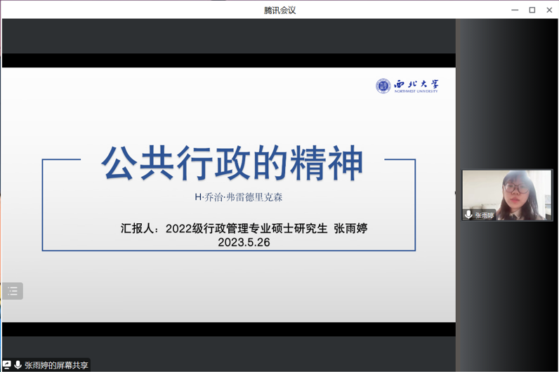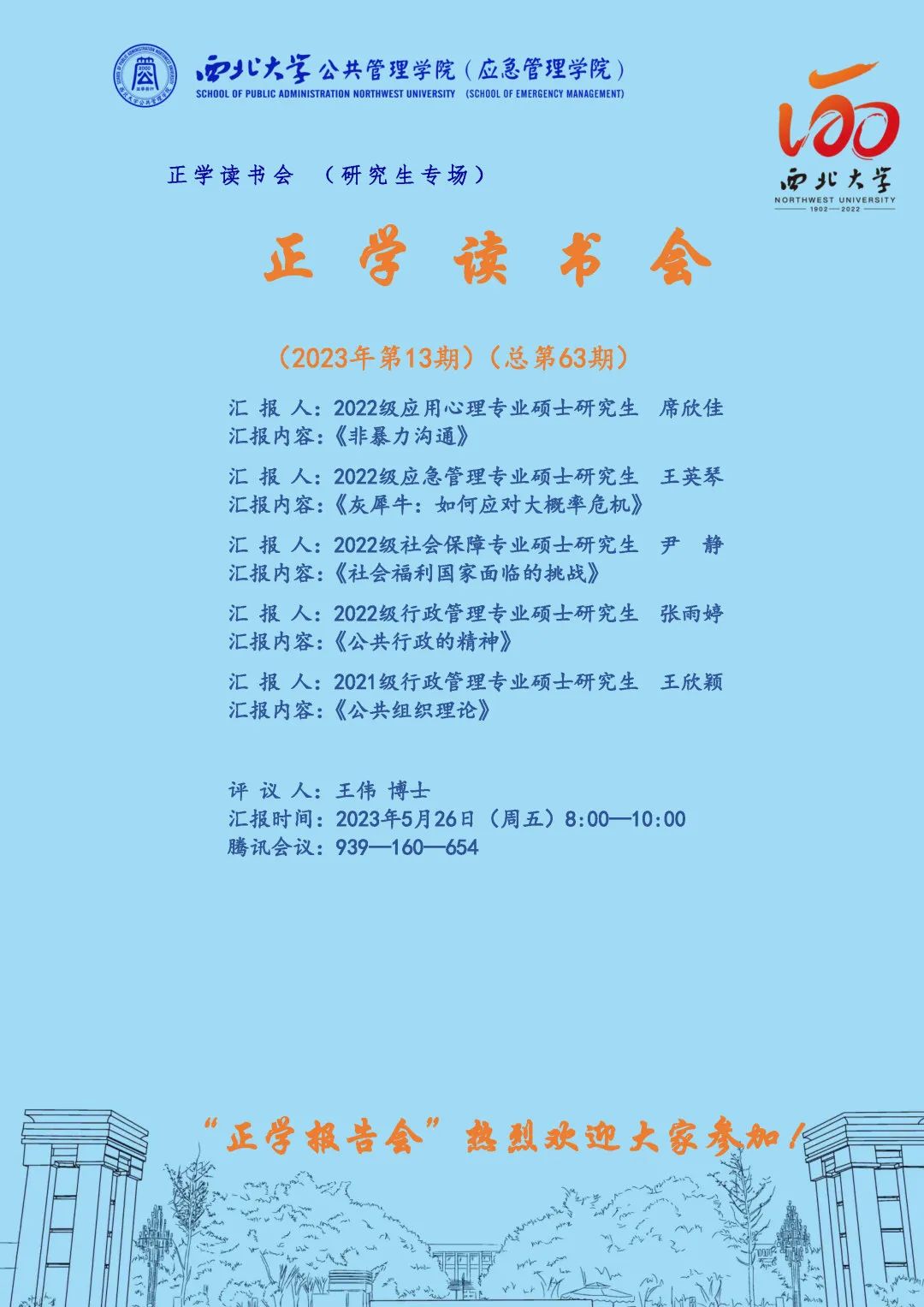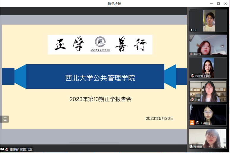 2023年5月26日下午,我院线上举办了2023年第13期正学读书会。2022级应用心理专业硕士研究生席欣佳、2022级应急管理专业硕士研究生王英琴、2022级社会保障专业硕士研究生尹静、2022级行政管理专业硕士研究生张雨婷、2021级行政管理专业硕士研究生王欣颖分别作为主讲人进行读书汇报,公共管理学院2022级博士研究生王伟担任评议人,部分研究生旁听了此次报告会。