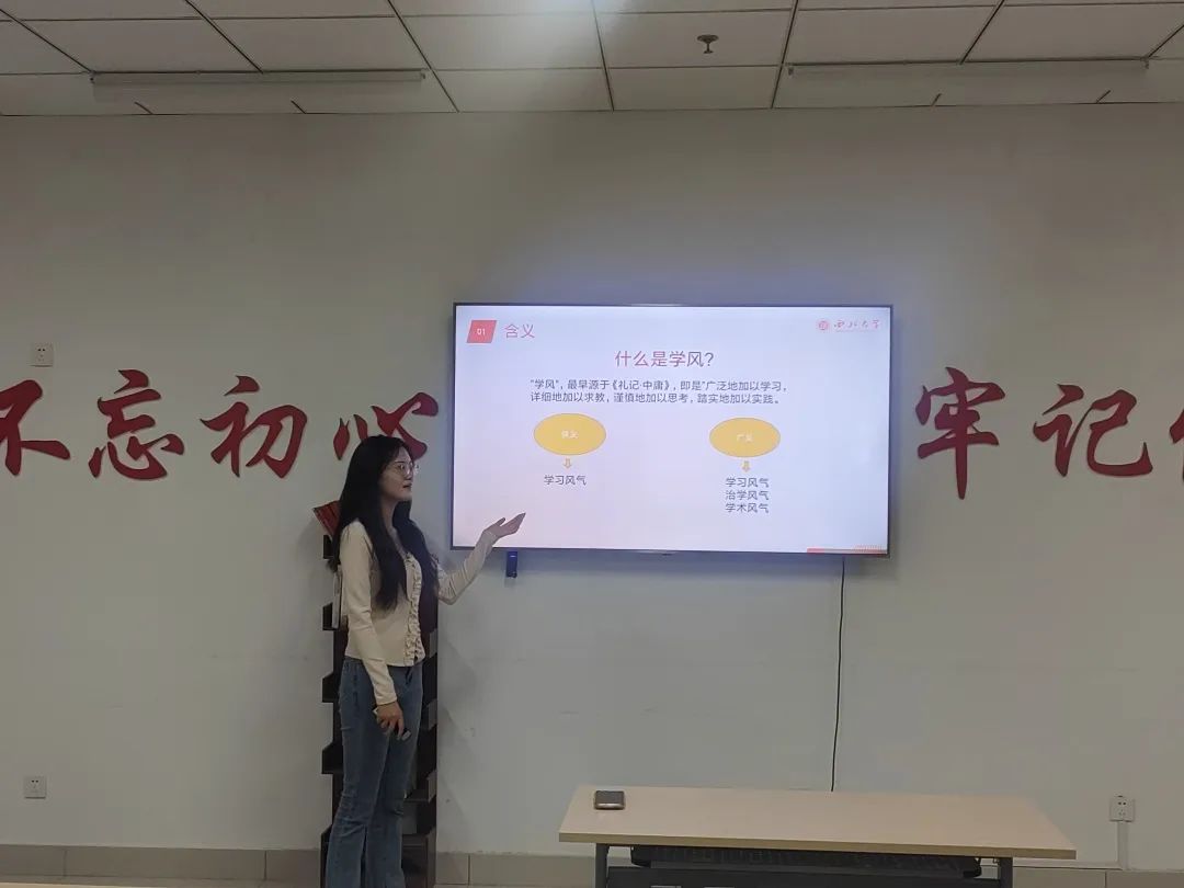 首先,班长王淼提出了“学风是什么”的问题,她指出“学风”最早源于《礼记·中庸》,并有狭义和广义之分。学风既是一种学习氛围,同时又是一种群体行为,不但能使学生受到潜移默化的熏陶和感染,还能内化为一种向上的精神动力。在优良学风的环境里,学生的思想品德、价值观念、行为方式、意志情感等都会发生变化,并反过来对自己的成长成才和职业生涯发展产生深远的影响。学风归根到底是学生对待学习这个问题上的思想态度和行为表现,它通过学习目标、学习态度、学习纪律、学习方法、学习兴趣、学习效果等具体地反映出来。这就在不同层次上构成了学风的要素。