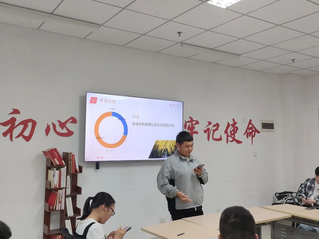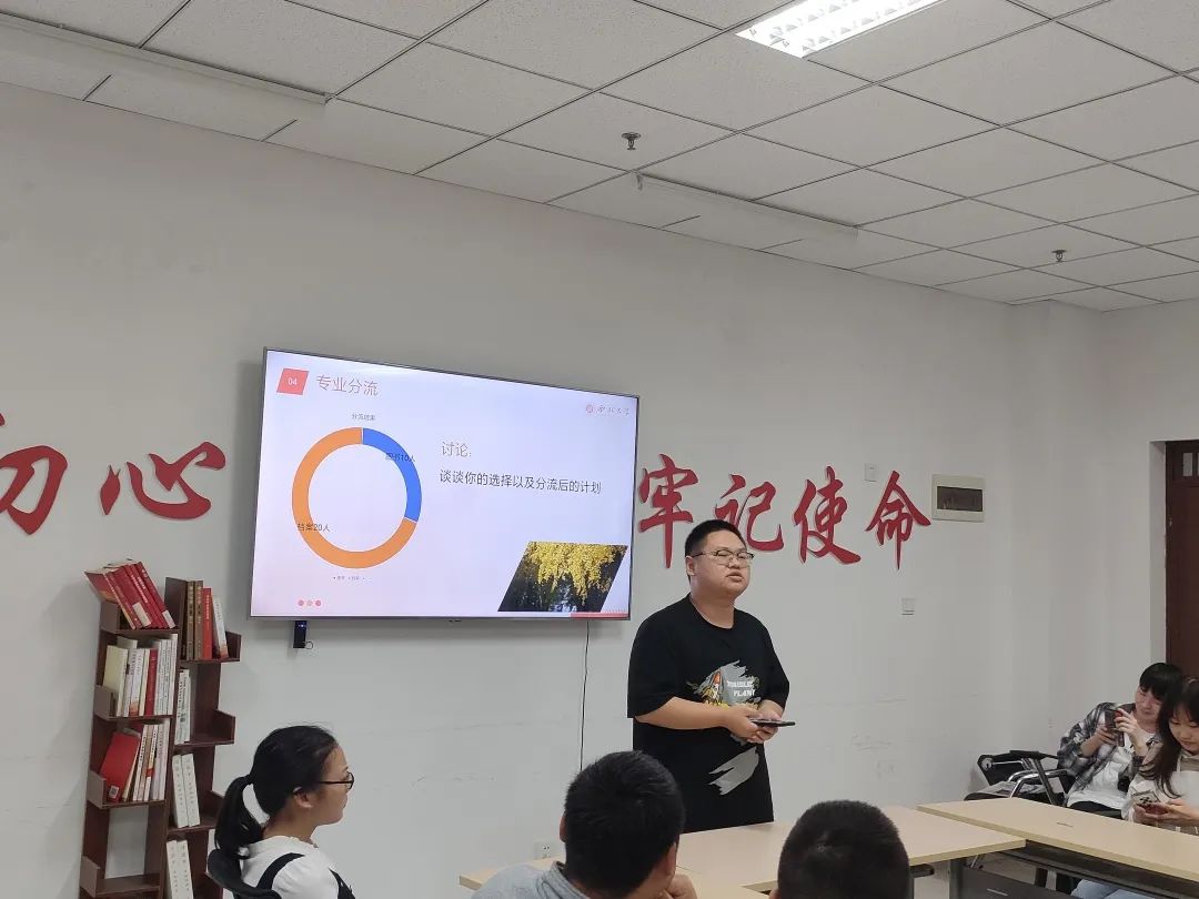 接下来,就专业分流的相关问题,班长带领大家分析了本班同学上学期期末考试情况以及专业分流情况,班级同学就如何选择以及对未来学习生活的规划进行了讨论。