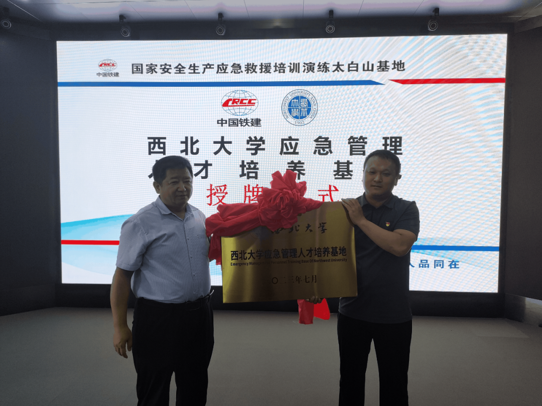 会上,与会成员集体观看了安全生产应急救援宣传片。中铁二十局技工学校党总支书记、校长杨鹏演同志对国家安全生产应急救援培训演练基地进行了简要介绍,他指出基地作为产教融合的重要载体,未来将持续深入探索“理论+实操”的定点式服务,大力推动校企合作双向赋能模式。公共管理学院党委副书记韩杰同志和基地负责人杨鹏演同志共同为西北大学应急管理人才培养基地揭牌,并向杨鹏演同志颁发“西北大学公共管理硕士行业导师”聘书。最后,学院党委书记窦争光同志做总结讲话,他表示,此次会议是公共管理学院推动“产教融合、校企合作”人才建设迈出的关键一步,双方将通过协同育人、双向互动,共同建设应急安全领域“双师型”教师培育及创新型复合型应用型应急人才培养,期望与国家安全生产应急救援培训演练基地开展产学研一体的深度合作,以促进双方携手共进、合作共赢。