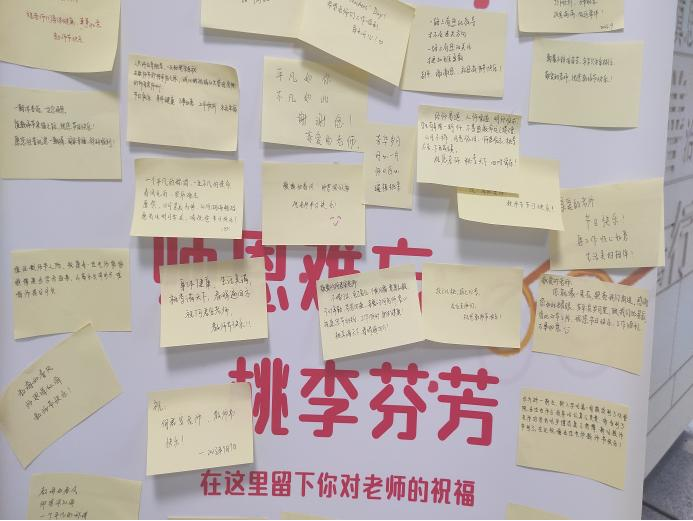同学们将自己想对老师说的话写在便利贴并贴在祝福墙上,表达对老师们的祝福:“提灯引路,育梦成光,感谢老师的辛苦付出,祝您节日快乐!身体健康!”;“祝老师节日快乐,身体安康,桃李满天下”;“很幸运在研究生求学路上成为您的学生,祝您教师节快乐,工作顺利,学术长青!”。一言一语,都表达着同学们对老师的尊敬和热爱。