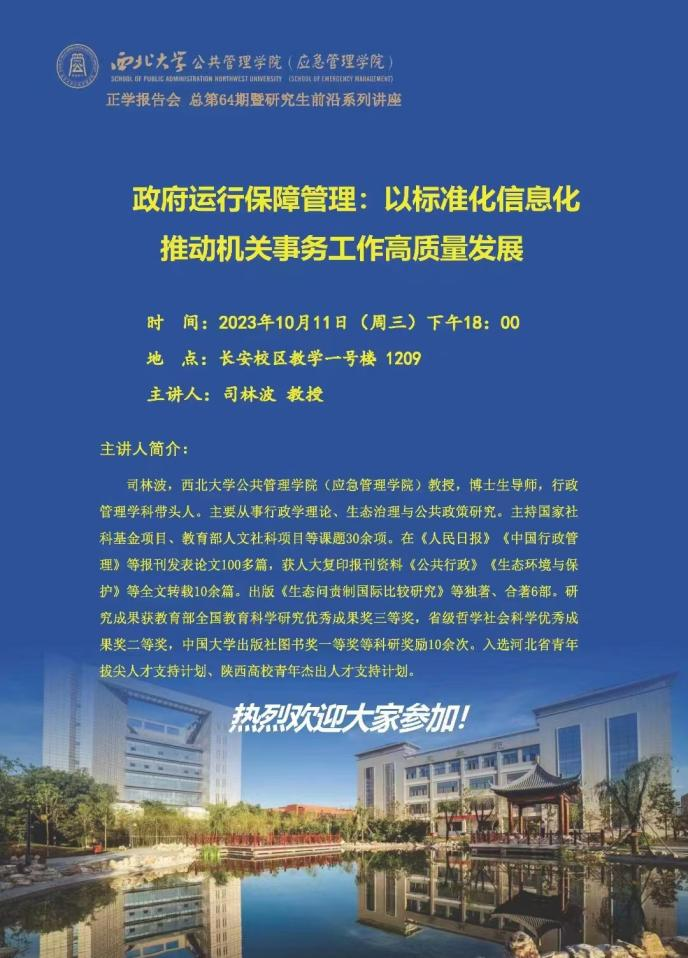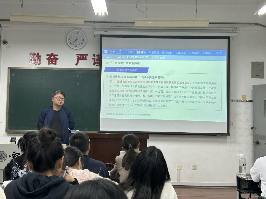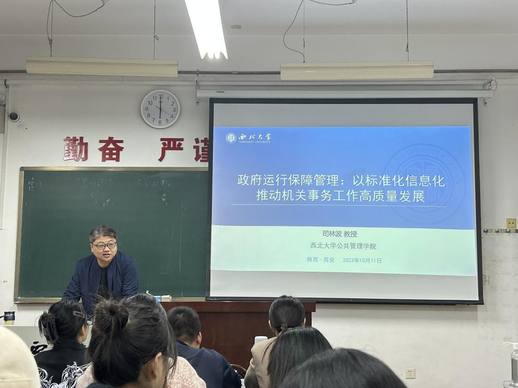 2023年10月11日晚,西北大学公共管理学院司林波教授在长安校区1209教室为我院2023级全体硕士研究生作了题为“政府运行保障管理:以标准化信息化推动机关事务工作高质量发展”的专题讲座。