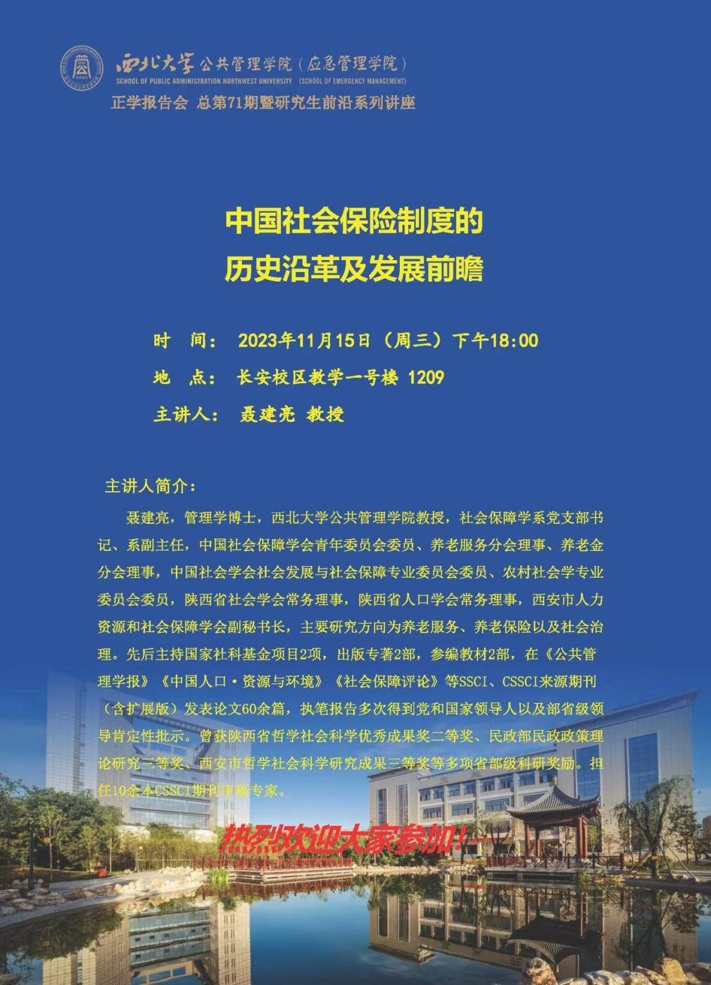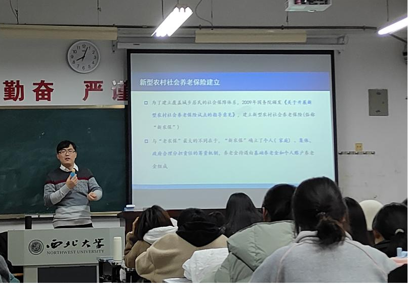 2023年11月15日晚,西北大学公共管理学院聂建亮教授在长安校区教学一号楼1209教室为我院2023级全体硕士研究生作了题为“中国社会保险制度的历史沿革及发展前瞻”的专题讲座。