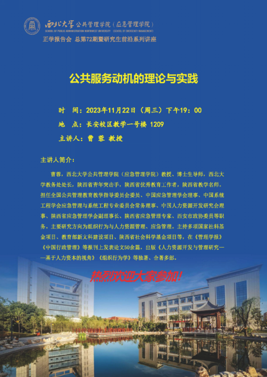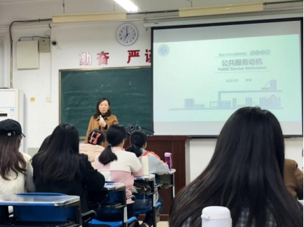 2023年11月22日晚,西北大学公共管理学院曹蓉教授在长安校区教学一号楼1209教室为我院2023级全体硕士研究生作了题为“公共服务动机的理论与实践”的专题讲座。
