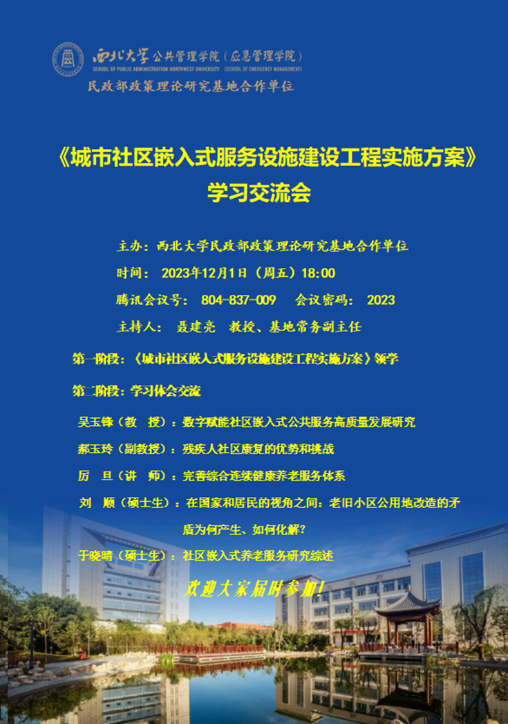 2023年12月1日,民政部政策理论研究基地合作单位在线举办了《城市社区嵌入式服务设施建设工程实施方案》学习交流会。会议由基地常务副主任聂建亮教授主持,基地专家吴玉锋教授、郝玉玲副教授、厉旦博士以及基地相关学者及博硕士生等三十余人参加了会议。