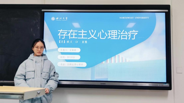 2022级应用心理学专业硕士研究生甘雅晴分享的书目是欧文·亚隆的《存在主义心理治疗》,她的汇报围绕作者简介、作品简介以及书里四个生命终极关怀进行展开。她首先对存在主义哲学以及存在焦虑进行了简要介绍,其次,她解释了存在主义心理治疗的含义就是一种以动力学分析为基础,从存在主义哲学延伸出的心理治疗方法。接着,她详细介绍了作者对死亡、自由、孤独以及无意义感的诠释和相应的治疗方法,同时她结合书中的多个案例对这四个人生终极关怀进行了简要的说明。最后,在总结概括这本书的基础上,她提出了自己的阅读感悟与理解。
