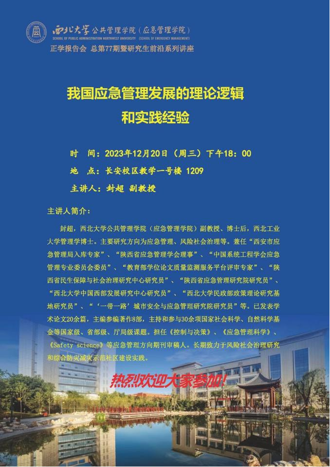 2023年12月20日晚,西北大学公共管理学院封超副教授在长安校区教学一号楼1209教室为我院2023级全体硕士研究生作了题为“我国应急管理发展的理论逻辑和实践经验”的专题讲座。