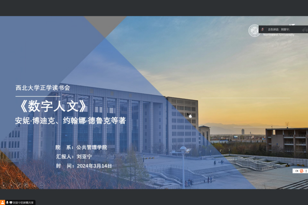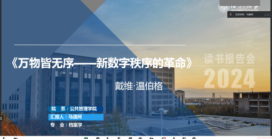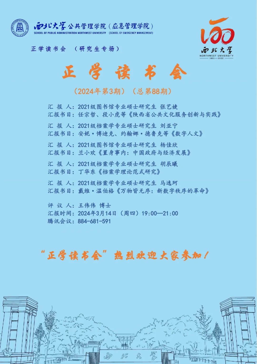 2024年3月14日晚上,我院线上举办了2024年第3期正学读书会。西北大学公共管理学院2021级图书馆专业硕士研究生张艺婕、2021级档案学专业硕士研究生刘亚宁、2021级图书馆专业硕士研究生杨佳欣、2021级档案学专业硕士研究生胡辰曦、2021级档案学专业硕士研究生马逸珂分别作为主讲人进行读书汇报,2022级公共管理专业王伟伟博士担任评议人,部分研究生旁听了此次会议。