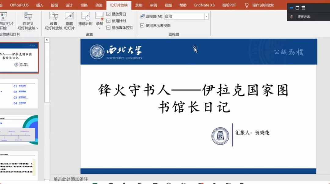 韦东增博士对其汇报做出点评,他首先肯定了贺秉花同学汇报的逻辑性,指出她从文化和历史的角度对战火纷争国家图书馆发展建设现实,让人感受到其发展的不易。其次,韦东增博士讲述了自己对这本书的看法,他指出萨德这本书以日记式的形式展开,非常引人入胜,远比任何新闻报道更具现场感和说服力,作者非记者,而是正在上演的现实悲剧的剧中人。唯有这本日记让人感受迫在眉睫的危险和恐惧,这种源自于现实的真实给人的感受式震撼的。同时,韦东增博士提出,我们应该珍惜祖国今天的和平,并为守护祖国的和平繁荣贡献自己的一份力量。