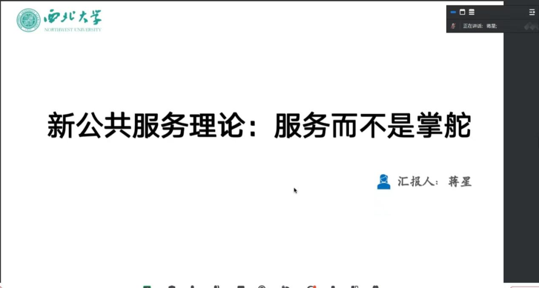 韦东增博士对其汇报内容做出点评。他首先肯定蒋星同学清楚地梳理了本书主要观点,并指出本书具有一定纲领性和科普性。此外,韦东增博士认为该同学在新公共服务现实启示部分提出了自己的观点和疑惑,有助于理解作者的思想理论,推荐大家阅读。