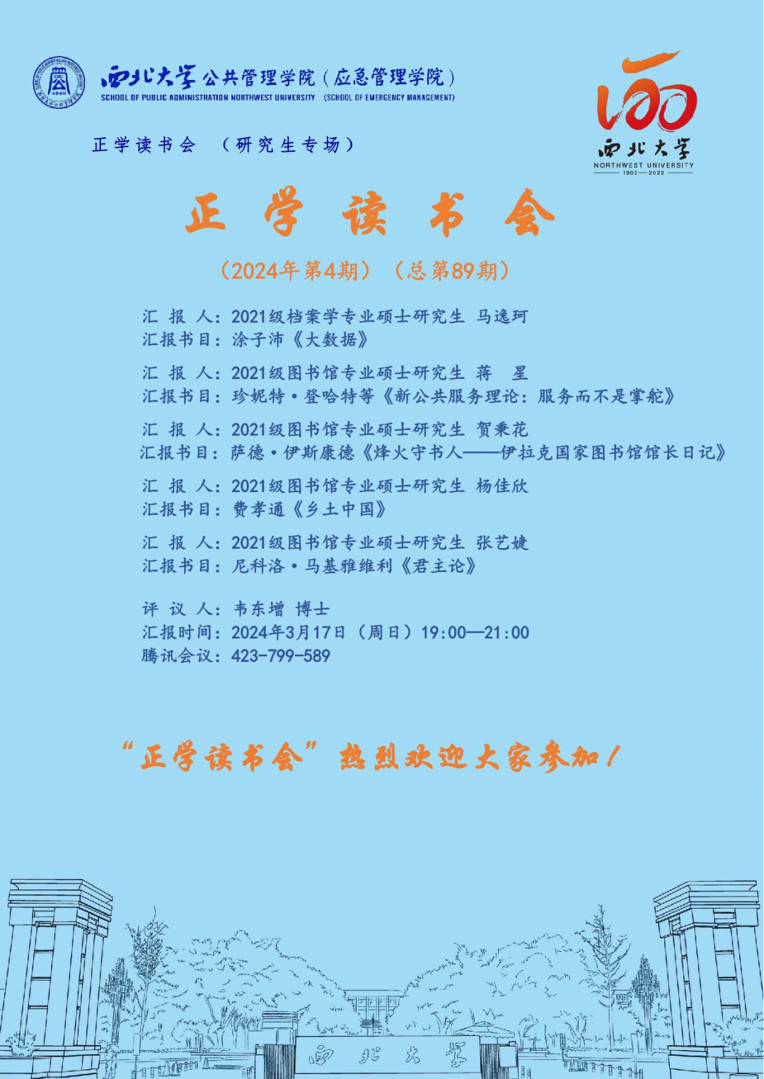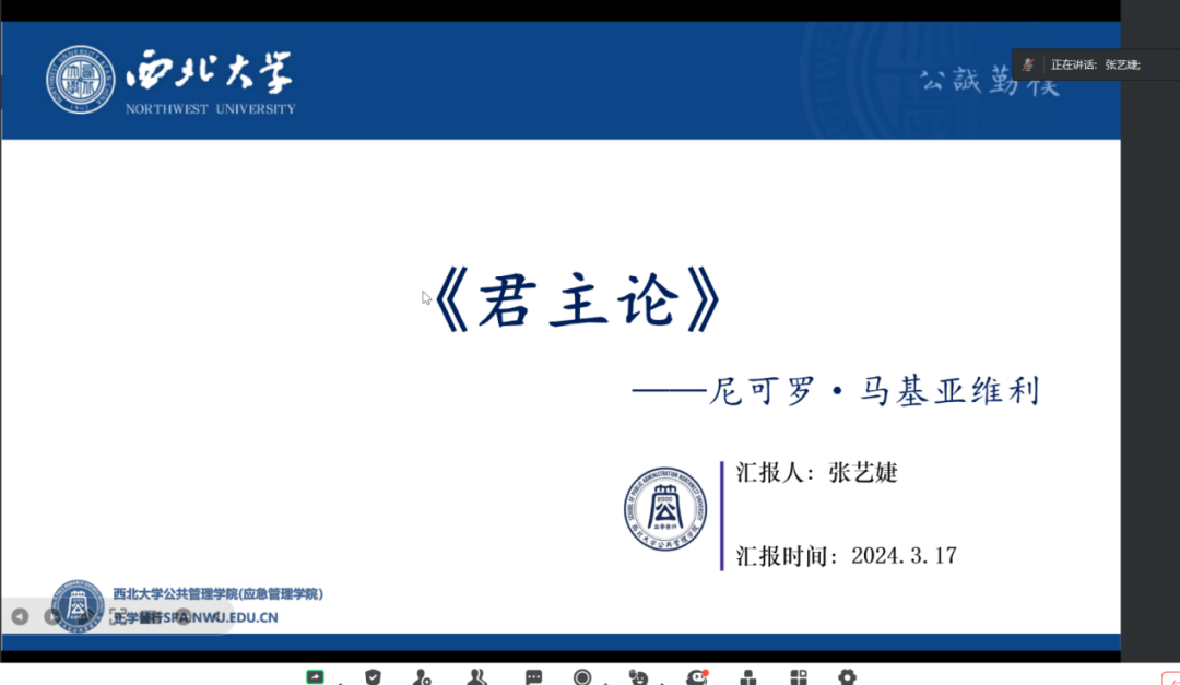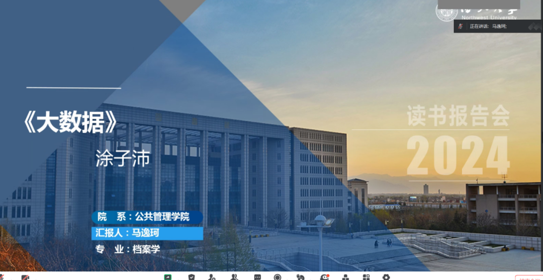 2024年3月17日,我院线上举办了2024年第4期正学读书会。西北大学公共管理学院2021级档案学专业硕士研究生马逸珂、2021级图书馆专业硕士研究生蒋星、2021级图书馆专业硕士研究生贺秉花、2021级图书馆专业硕士研究生杨佳欣、2021级图书馆专业硕士研究生张艺婕分别作为主讲人进行读书汇报,2023级公共管理专业韦东增博士担任评议人,部分研究生旁听了此次会议。