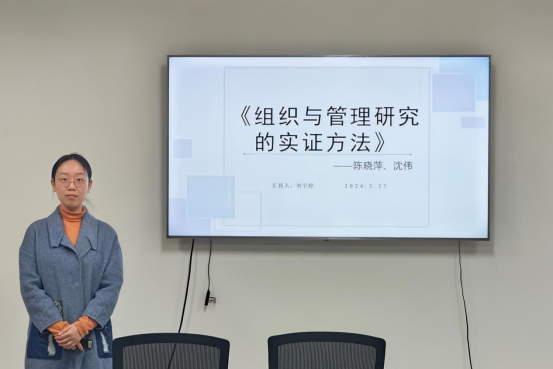 2023级社会保障专业硕士研究生刘宇婷分享的书目是陈晓萍的《组织与管理研究的实证方法》,她围绕书籍与作者简介、内容分享与个人感悟展开汇报。首先,她简要分享了书中关于建立思维方式、理论构建以及管理研究全过程的相关内容。其次,她介绍了作者对研究问题的看法:作者认为对研究者而言,做研究应该不仅仅为了解决一个实际问题,更重要的是如何把一个实际问题抽象出来,并把这些抽象出来的概念的联系挖掘出来。最后,她简要列举了书中总结的科学研究方法,分享了自己在利用相关研究方法的经验和感悟,并强调了在学术研究中科学、合理使用研究方法的重要性。