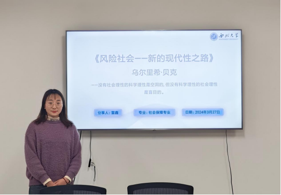 2022级社会保障专业硕士研究生雷鑫分享了乌尔里希·贝克的《风险社会——新的现代性之路》,她主要从作者简介及创作背景、主要内容、现实意义和个人思考三个方面展开。首先,她将本书主要分为三部分并着重介绍了书中的重要概念,分别包括“风险和风险社会”“风险生产-分配的逻辑”“个体化-工业社会中个人的生活方式去传统化”和“科学与技术可能是风险的成因”。紧接着,她结合相关典型案例对核心概念进行了解释论述。最后,她从宏观角度出发,结合风险社会理论总结出我国当前面临多重风险的叠加,并基于专业知识对我国当前经济高速发展下面临的新型劳动关系改变、人口结构失衡、贫富分化加剧等风险做出深入的思考与阐述。