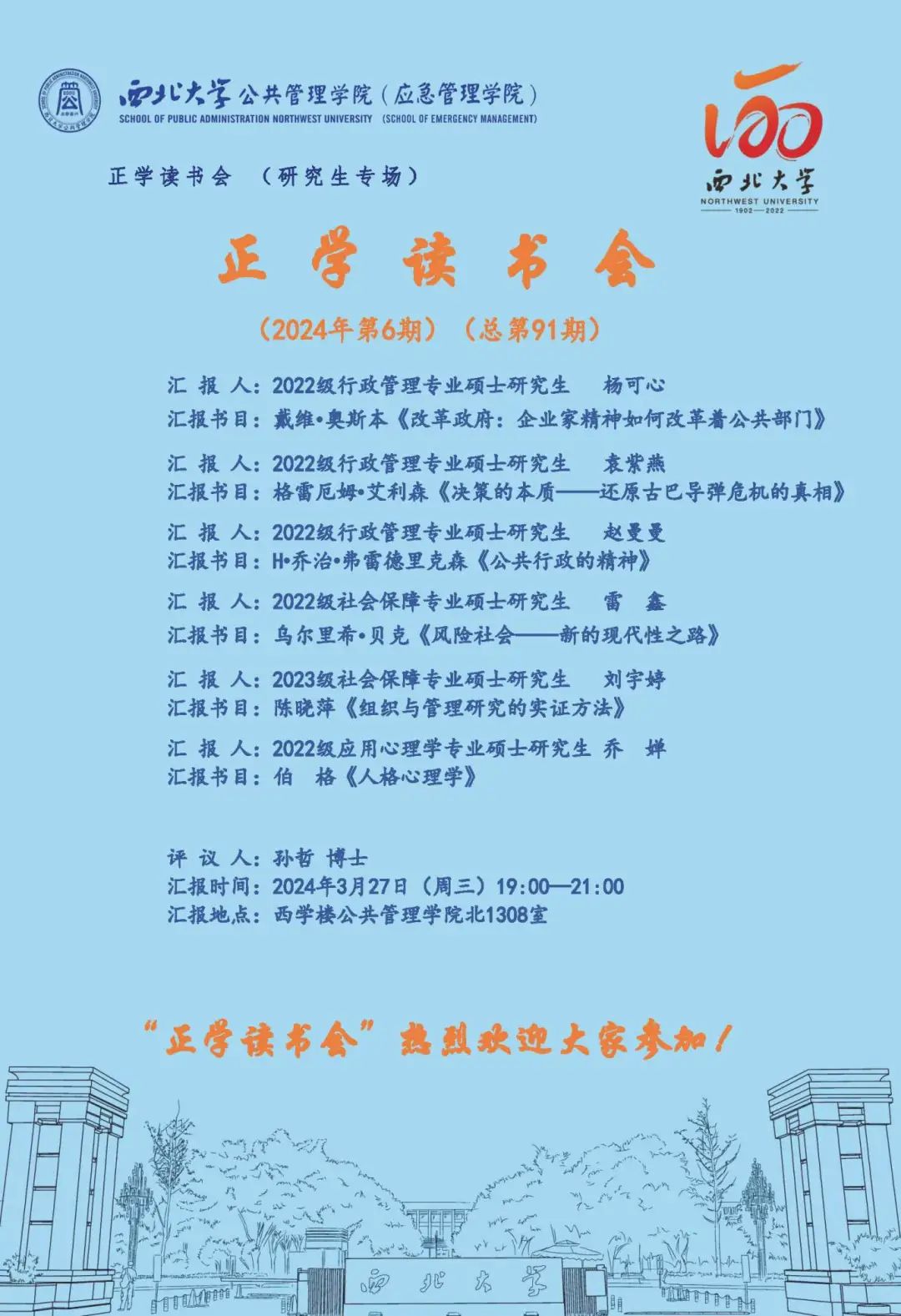 2024年3月27日晚,我院在西学楼北1308室举办了2024年第6期正学读书会。西北大学公共管理学院2022级行政管理专业硕士研究生杨可心、袁紫燕、赵曼曼,2022级社会保障专业硕士研究生雷鑫、2023级社会保障专业硕士研究生刘宇婷、2022级应用心理学专业硕士研究生乔婵分别作为主讲人进行了读书汇报,公共管理学院2022级博士研究生孙哲担任评议人,部分研究生旁听了此次报告会。