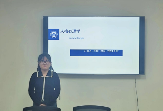 2022级应用心理学专业硕士研究生乔婵分享了伯格的《人格心理学》一书,她的汇报主要从人格的定义、人格心理学的研究方法、人格心理学的流派等方面展开,并结合相关研究分享了读书感悟。首先,她从心理学六大流派对人格结构、动力及影响因素的区别进行了概括性的介绍。紧接着,她对人本主义心理学流派在人格心理方面的相关研究进行了总结,并且着重阐释了人本主义心理学流派对人的自我表露和孤独方面的相关研究,列举了线上自我表露和面对面自我表露的差异。最后,她认为在该书中作者比较系统、全面、客观地介绍了人格心理学各大流派及相关研究,是了解学习人格心理学相关流派的经典著作。