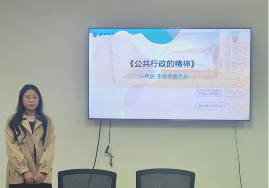 2022级行政管理专业硕士研究生赵曼曼向大家分享了H·乔治·弗雷德里克森的《公共行政的精神》,她分别从作者简介、写作背景与目的、主题框架与内容、思考与感悟四个部分进行了汇报。首先,她简要介绍了作者的经历与成就,强调了弗雷德里克森对新公共行政做出的重要贡献。其次,她从社会背景和学术背景两方面讨论了此书的写作背景,指出作者在新的历史环境与条件下,对公共行政领域的重大理论和现实问题做出了进一步诠释。此外,她基于本书的逻辑框架,围绕“政府责任”“社会公平”以及“公民精神”三个关键词阐述了作者的主要观点。最后,她指出该书对公共行政领域的重大价值和存在的局限性,她认为书中对社会公平和行政伦理价值的强调为我国行政体制改革和公务员精神重塑提供了借鉴。