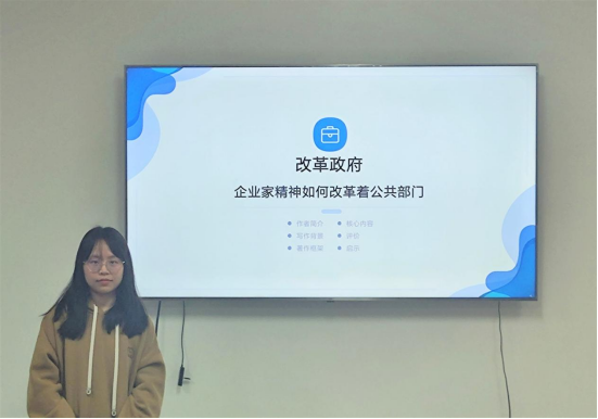 2022级行政管理专业硕士研究生杨可心分享的书籍为戴维·奥斯本与特德·盖布勒合作撰写的《改革政府:企业家精神如何改革着公共部门》,她分别从作者简介、写作背景、著作框架和核心观点、评价与思考这四个方面进行了分享。她首先对作者以及写作背景进行了简单介绍。在梳理了全书章节和内容后,她引出了“企业家政府理论”这一核心观点,并对其概念内涵进行了详细解释。随后,她分析了“企业家政府理论”对公共行政领域的贡献以及存在的不足之处。最后,她提到了“企业家政府理论”对中国行政改革实践的借鉴意义并分享了自己的读书感悟。