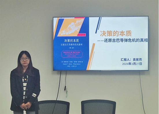 2022级行政管理专业硕士研究生袁紫燕分享了格雷厄姆•艾利森的《决策的本质——还原古巴导弹危机的真相》,她从推荐理由、本书简介、主要内容以及个人感悟四个部分展开。首先,她简要介绍了本书的写作背景、研究主题和作者简介,指出该书将理论与案例相结合,有助于普通公民更好地理解政府与国家的行动。紧接着,她从本书写作的目标定位和核心内容出发,指出本书全景式地勾勒了古巴导弹危机中美方的决策模式和决策过程,理性选择、组织行为和政府政治三种决策模式揭示了古巴导弹危机甚至是一般的外交危机决策的本质。随后,她对本书核心内容进行了简要分享,以美国对苏联部署导弹的反应为例,指出从不同的概念透镜视角出发,会对同一事件的重要影响因素给予不同的关注和解释。最后,她总结出任何的决策都是复杂的,选取的视角不同,所关注的问题、归因、得出的结论也存在差异,需要把这种思想应用于解决实际问题中。