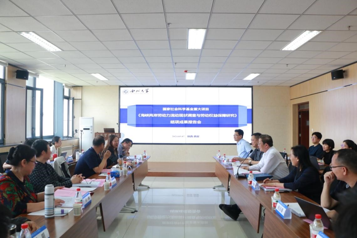 2024年5月7日下午,由公共管理学院席恒教授担任首席专家的国家社科基金重大项目《海峡两岸劳动力流动现状调查与劳动权益保障研究》结项成果报告会在西学楼13层多媒体会议室成功召开。中国社会保险学会会长、人社部原副部长胡晓义,北京大学校务委员会副主任、校党委原副书记、校纪委原书记、法学院教授叶静漪,中国社会科学院台湾研究所研究员、《台湾研究》主编刘佳雁,厦门大学台湾研究院经济研究所教授、台湾研究中心副主任、《台湾研究集刊》主编王华,厦门大学台湾研究院社会研究所执行所长、副教授肖日葵,中国社会保险学会社会保险基金投资管理专委会副秘书长查鸿宁、西北大学曹蓉副校长莅临本次会议。公共管理学院席恒教授、张正军教授、许琳教授、周明教授、翟绍果教授、吴玉锋教授、聂建亮教授、唐丽娜副教授、郝玉玲副教授、李东方老师、任行老师、祝毅老师、厉旦老师、王昭茜老师等及课题组博硕生三十余人参加了此次报告会,报告会由席恒教授主持。