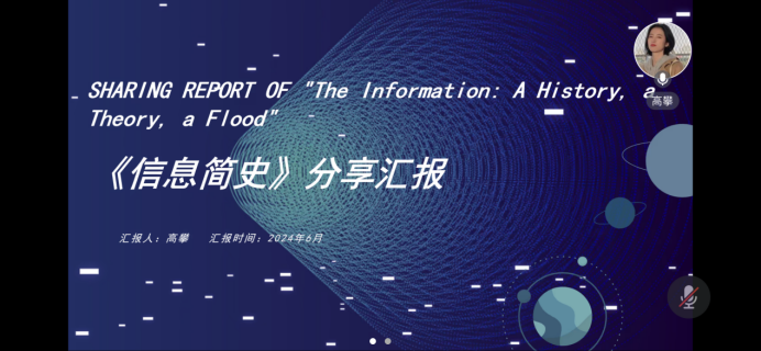 牛雪婷博士对其汇报内容做出点评。首先,她认为高攀同学从该书的结构内容进行分享汇报逻辑清晰、总结到位、内容全面。其次,她指出这本书系统地回顾了信息的一个发展史,从原始部落的时代用鼓声来传达信号,到文字的出现和香农提出的信息论,再发展到如今的量子信息。最后,她指出这该书非常具有现实科普意义,倡导大家学习阅读。