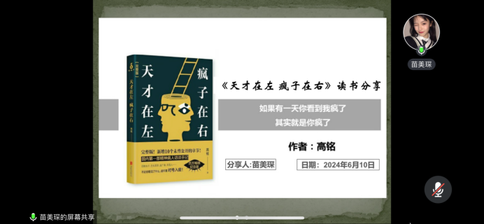 2022级行政管理专业硕士研究生苗美琛分享了高铭的《天才在左 疯子在右》,她主要从作者简介、书籍介绍、片段赏析、感悟与总结四个方面展开分享。她首先简单介绍了该书的作者,作者由于对精神病患、心理障碍者以及边缘人的内心世界产生了强烈的好奇,于是工作之余利用闲暇时间,各种手段倾听这部分特殊人群的心声后整理成的笔记,也是国内第一本精神病人的访谈手记。接着,她通过列举书中精神病人的例子,如将人类映射成动物的女孩、坚信女人会统治世界的男人等分享阅读体会。最后,她分享了自己的阅读感悟,每阅读完一个精神病人的故事,都会不自觉地发出一声感叹,也为他们开阔的思维和丰富的想象力所折服。也许是一致生活在既定的模式中随意一瞥过于跟着习惯走,思维也变得僵化。在看书过程中发现精神病人不仅有着出色的逻辑思维能力,有的还有着深厚的知识储备,他们虽是患者,但思维却独特得令人惊叹。