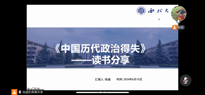 牛雪婷博士对其汇报内容做出点评。首先,她对张越同学汇报内容的完整性和丰富性给予肯定,并指出张越同学的汇报内容表达流畅,思路清晰。其次,牛雪婷博士谈到,整个中国历代政治其实是一个逐渐衰败的过程,犹如一个人的成长,从气血旺盛的壮年慢慢进入年老力衰的暮年。不能因为明清的专制,而否定前朝历代的政治功德。最后,牛雪婷博士鼓励大家多多思考,带着问题进一步研读和学习。