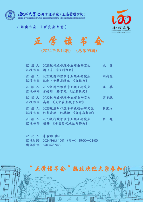 2024年6月10日,我院线上举办了2024年第14期正学读书会。西北大学公共管理学院2023级行政管理专业硕士研究生龙巨、张越,2022级图书馆学专业硕士研究生刘向花、高攀,2022级行政管理专业硕士研究生苗美琛、2023级应用心理学专业硕士研究生崔潆方分别作为主讲人进行读书汇报,公共管理学院2023级博士研究生牛雪婷担任评议人,部分研究生旁听了此次报告会。