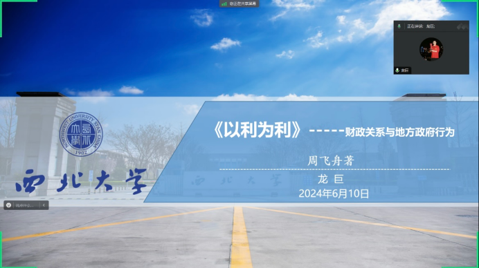 2023级行政管理专业硕士研究生龙巨分享的书籍是周飞舟的《以利为利——财政关系与地方政府行为》。他从历史背景、分税制改革、改革之后以及个人感悟四个部分展开。首先,他介绍了历史上财政关系经历的多次变革,并提出最近一次改革是1994年开始推行的“财政包干制”向“分税制”的财政体制改革。随后,他总结了书中提出的分税制改革的影响:一是中央对地方经济和财政的失控;二是农村基层政权的空壳化;三是脱离工业化的盲目城市化。最后,他表示道,对于政府而言财政增长、经济增长不是最终目的,人民才是最终目的、立国之本。