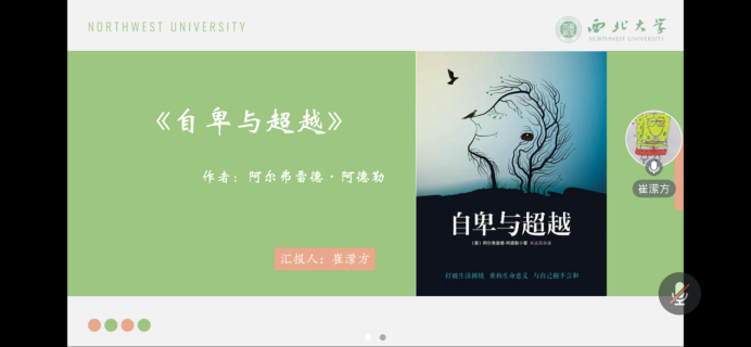 牛雪婷博士对其汇报内容做出点评。首先,她表示这本书是心理学的经典书目,作者阿德勒也是非常重要的心理学家,同时肯定了崔潆方同学的汇报内容和思考总结。其次,她指出该书所提到的自卑与我们平时所提的自卑不同,该书中的自卑是我们实现自我超越、个人成长以及他人合作的重要动力源泉。她指出,我们通过阅读此书更是对自我成长有重要意义,能让我们重新认识自卑,分析自卑,并将自卑转化为动力,不断实现自我超越。