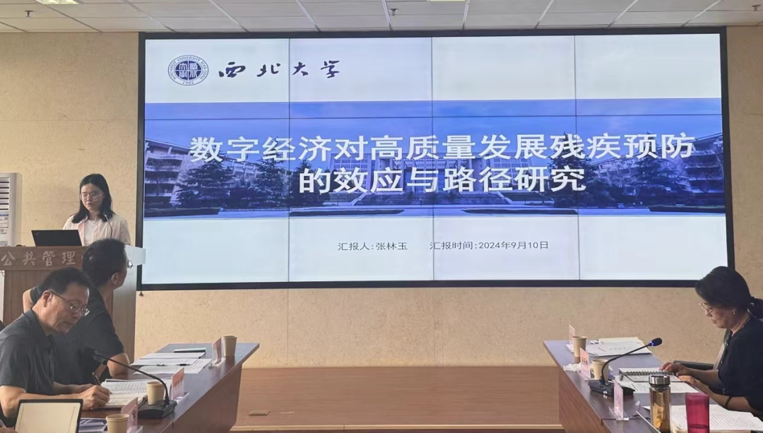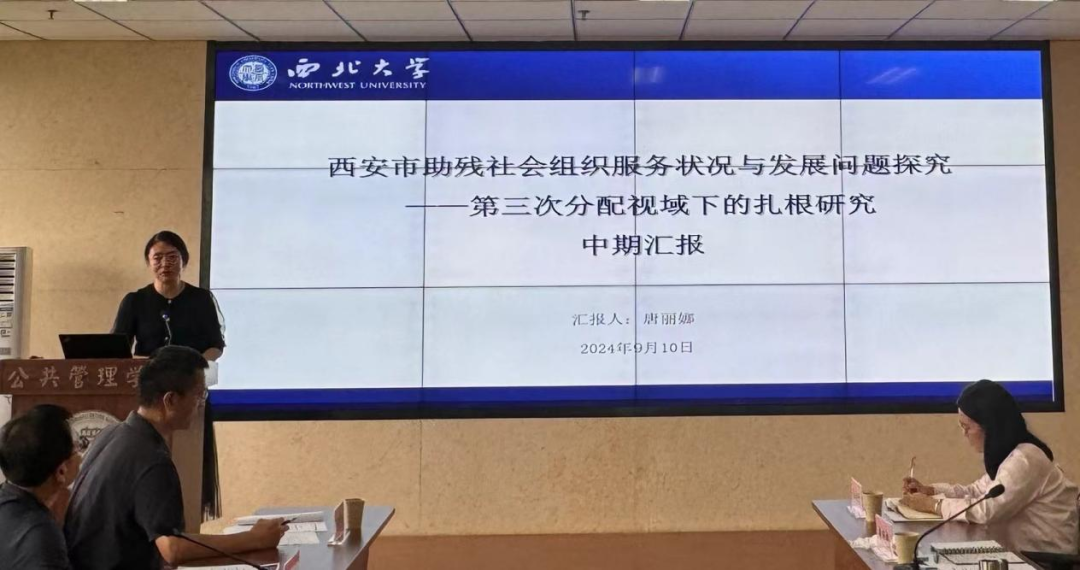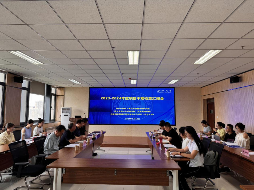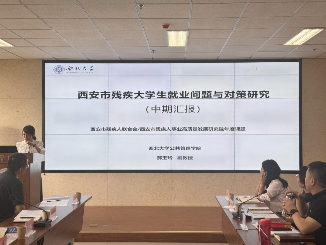 推动残疾人事业高质量发展不仅能够促进残疾人群体平等参与社会生活,提高其生活质量,增强他们的幸福感与获得感,还有助于构建包容和谐的社会环境,进一步提升整个社会的文明程度和发展水平。2024年9月10日下午,由西安市残疾人事业高质量发展研究院、西北大学公共管理学院(应急管理学院)和民政部政策理论研究基地合作单位(西北大学)主办的“西安市残疾人事业高质量发展研究院2023—2024年度项目中期检查汇报会”在西北大学公共管理学院举行。会议由西安市残疾人事业高质量发展研究院常务副院长、西北大学公共管理学院副教授唐丽娜主持。西安市残疾人联合会党组成员、二级巡视员、副理事长何永国,西安市残疾人联合会一级调研员陈文社,西安市残疾人联合会组联处副处长梁晓鹏,西安市残疾人联合会劳动就业服务中心副主任姚伟,西安市残疾人事业高质量发展研究院院长、西北大学公共管理学院院长、教授雷晓康,西北大学公共管理学院副教授郝玉玲以及西北大学经济管理学院、西北大学公共管理学院的相关学者及博硕士生等二十余人参加了本次座谈会。