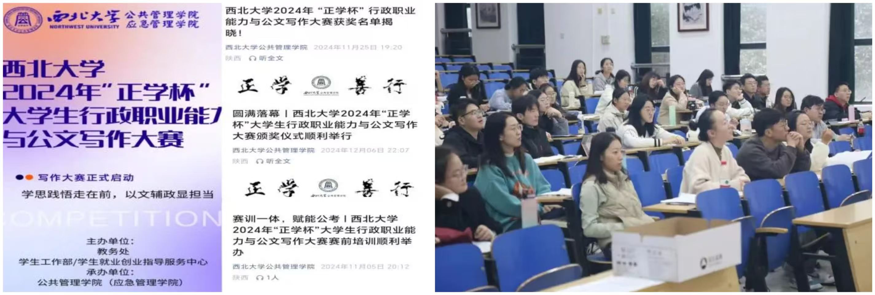 公共管理学院举办2024年“正学杯”大学生行政职业能力与公文写作大赛。邀请了四位在行政职业能力测试和公文写作领域深有研究的资深教师担任主讲老师,对参赛学子进行赛前培训,提升了同学们的语言理解与表达、逻辑推理、资料分析、问题分析与解决、公文写作等行政职业能力,为同学们备战考公之路点亮明灯、指引方向。