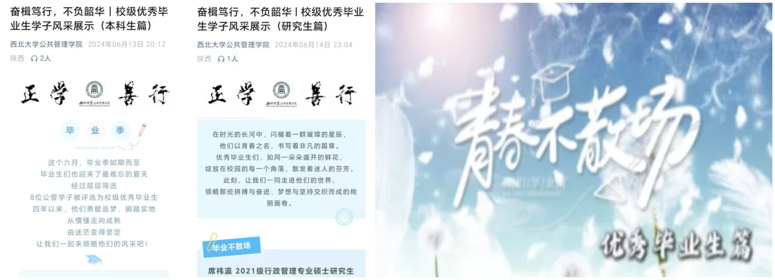 持续做好“校级优秀毕业生学子风采展示”专栏,发布1部风采展示视频短片及2篇推送,对获得校级优秀毕业生荣誉的公管学子进行了专题报道,激励同学们沿着榜样的脚步,怀着理想和希望砥砺前行。