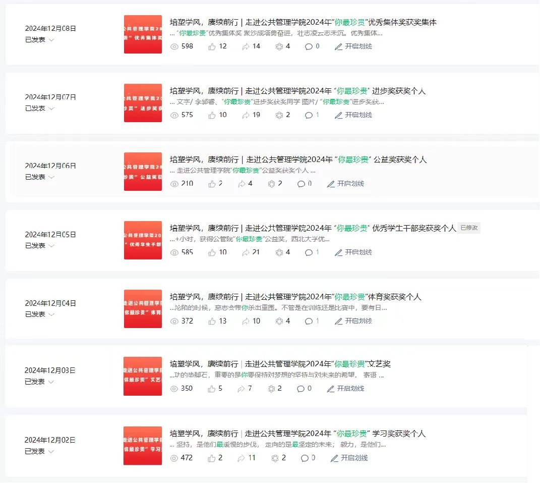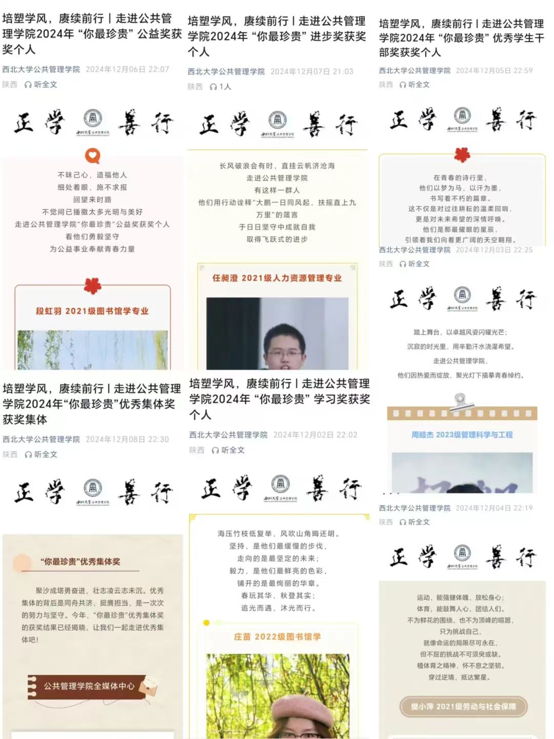 学院隆重举行“你最珍贵”优秀学生表彰大会,对2022年和2023年在不同领域争先创优、勇创佳绩、为院争光的优秀个人和先进集体进行表彰,共颁发学习奖、体育奖、文艺奖、进步奖、公益奖、优秀学生干部奖、优秀集体奖等七项荣誉奖励。在学院官方微信公众号对获得“你最珍贵”奖项的优秀公管学子风采进行了集中展示,共发布10篇推送,对获得表彰的优秀集体与个人进行事迹报道,激励公管学子于回首过去中撷取经验,于展望未来中务实进取,不断向榜样模范看齐。