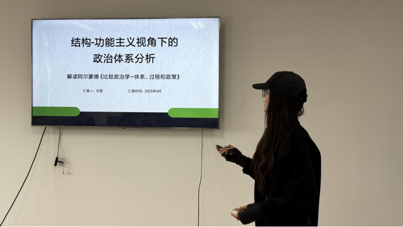 郑冰茹博士对任莹同学的汇报内容进行点评。她指出任莹同学的分享“兼具理论深度与现实关怀”,表明她对阿尔蒙德结构-功能主义的理解尤为透彻,尤其在解析政治文化与结构分化时,能结合中国治理案例阐述文化世俗化与政策精细化的互动,展现了跨学科思维。该书对理解全球政治多元性的现实意义重大。比较分析可揭示不同政治体系的异同,为中国治理现代化提供镜鉴。我们应该深入思考:“在全球化背景下,如何平衡结构效率与文化适应性,或许正是数字时代政治发展的新命题。”此次分享不仅展现了阿尔蒙德理论的学术价值,更激发了对比较政治学前沿问题的思考。