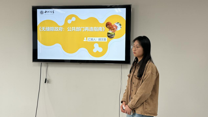 2023级行政管理专业硕士研究生顾文蕾分享了拉塞尔·M·林登的《无缝隙政府:公共部门再造指南》一书。首先她对本书的背景及作者进行了简单介绍,本书的写作背景主要基于20世纪末公共部门面临的挑战和变革需求,公众对政府服务的期望日益提高,要求政府更加高效、透明和响应迅速。作者基于此背景创作了本书,并因此而成为无缝隙政府理论的创始人。接着她从公共机构面临的新现实、再造公共组织、齐心协力进行政府部门再造三个方面对本书的内容进行了简单总结:①无缝隙政府建立的历史背景和具体内涵;②再造政府的原则、战略和行动纲领;③案例分析及提出实施无缝隙政府服务的条件。并着重介绍了本书的理论建构以及现实贡献。最后她分享了对本书的个人感悟,结合我国正在大力推进以简政放权、放管结合、优化服务为核心内容的行政管理体制改革,在政府流程再造的过程中,顾客导向、竞争导向和结果导向是需要坚持的原则,《无缝隙政府 公共部门再造指南》给我国的行政管理体制改革和公共服务供给方式创新提供了很多智慧!