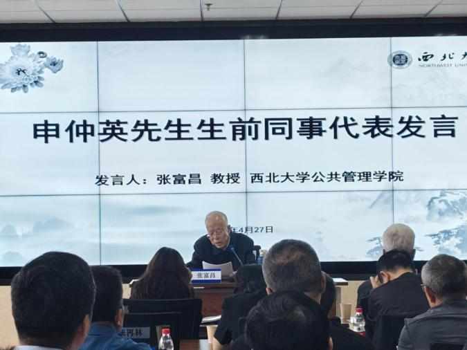 西北大学公共管理学院张富昌教授作为申仲英先生生前同事代表发言。张老师在发言中着重阐述了申老师在学科建设、教学和科研领域的重要贡献。申老师在教学方面提出 “强基础、宽口径” 的教育理念,扎实推进基础课程建设,全面开设专业课程,并以前瞻性的眼光引入自然科学课程。在科研方面,提出练好 “内功”筑牢根基的模式,形成学术佳作频出,学术氛围愈发浓厚。他还谈到申老师对自己和其他教授的帮助和支持,以及对公共管理学科的重大贡献,特别是行政管理专业的筹划、申报、开始、招生,以及提出 “强基础、专口径、重实践” 的人才培养模式等,为后来行政管理硕士点和公共管理博士点的申报奠定了坚实的基础。