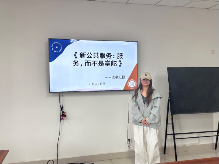 2024级行政管理专业硕士研究生陈莹分享的书籍是珍妮特·V·登哈特《新公共服务:服务,而不是掌舵》,她在读书报告中系统梳理了美国行政学家登哈特夫妇的新公共服务理论。首先她从作者入手,介绍了罗伯特・登哈特作为宪政主义者,重视理论与实务结合,反对新公共管理的过度工具化倾向,其妻珍妮特在组织理论领域的研究亦与其形成学术呼应,二人合著的《新公共服务》等著作成为该理论的重要载体。其次,她通过 “老公共行政 — 新公共管理 — 新公共服务” 的对比框架,清晰呈现了理论范式的演进。老公共行政秉持政治行政二分法,依赖科层制与规则实现效率;新公共管理引入企业管理技术,强调结果导向与市场竞争;而新公共服务则以公民为核心,提出七大核心理念,如 “服务公民而非顾客”“追求公共利益”“服务而非掌舵” 等,主张通过民主协作、责任多元性重构政府与公民的关系,凸显公共行政的宪政价值与伦理责任。