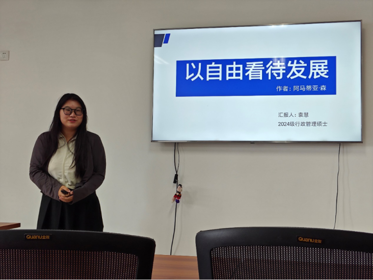 2024级行政管理专业硕士研究生袁慧分享的书籍是阿马蒂亚·森《以自由看待发展》。她首先简要介绍了一下作者的详细背景故事,阿马蒂亚・森,作为1998年诺贝尔经济学奖得主,在学界素有 “经济学良心的肩负者”“穷人的经济学家” 的美誉。其次详细阐述了《以自由看待发展》的核心观点。传统发展观往往聚焦于经济增长指标,而森则创新性地提出,发展的核心是扩展人们的真实自由。自由具有建构性和手段性双重作用,既是社会福利的核心标准,本身就是发展的目的,又能作为促进发展的重要工具。他通过大量统计学数据表明,政治权利能够唤起人们对普遍性需要的关注并要求恰当的公共行动,也能够对政府发挥激励作用。公开的讨论和批评对满足经济需要起着建设性作用。最后在社会机会方面,教育和医疗的普及能显著提升人们参与社会经济活动的能力在贫困研究方面,森的理论同样带来全新视角:他突破了权利分析方法的局限,将研究视角转向实质自由视角下的可行能力剥夺。传统以GDP、GNP衡量生活水准,用收入衡量贫困的方式存在诸多争议,而森强调以功能活动和可行能力作为生活水准和贫困衡量的标准。可行能力剥夺相较于收入剥夺,能更全面地解释贫困现象。