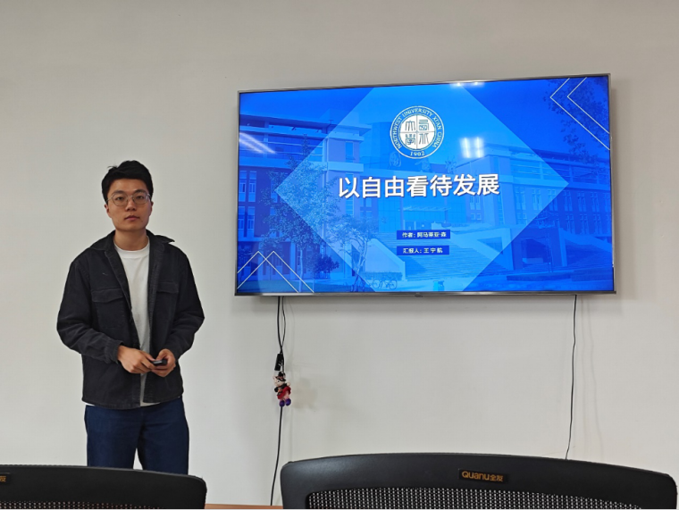 贺晓迎博士对王宇航同学的汇报内容做出点评。她认为其框架清晰完整,汇报对内容部分的阐述深入且有条理,既展现了对“自由与发展相互促进”逻辑的深刻理解,又通过案例体现了理论的现实解释力,不仅深化了对书籍内容的认知,也为后续探讨提供了有益思路。