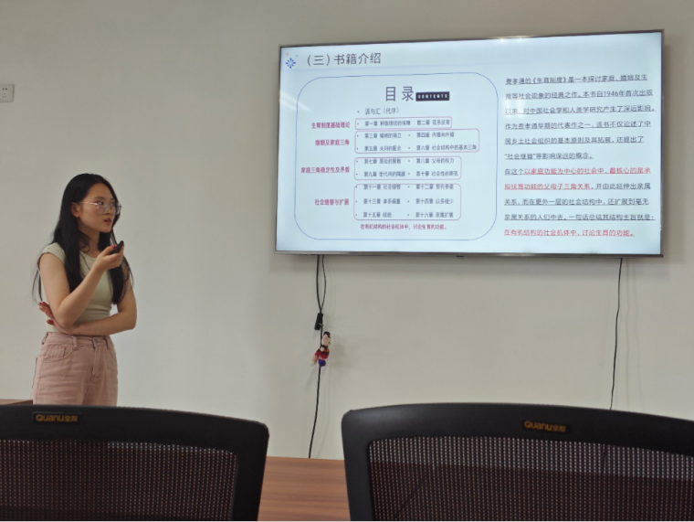 2024级社会保障专业硕士研究生张宇卉分享的书籍是费孝通《生育制度》,她从作者及书籍介绍、核心内容和读书感悟三个方面展开。首先她对费孝通先生的学术思想及贡献做了介绍,接着从生育制度、婚姻制度、家庭三角及社会继替四方面对该书进行了介绍,指出作者核心内容是在有机结构的社会机体中,讨论生育的功能。书中将生育从单纯的生物本能中剥离,揭示其作为社会制度存在的深层逻辑,指出生育的功能是为社会提供新分子,而婚姻的本质与意义在于确定双系抚育,确保新个体顺利成长,掌握生产技能,得以参与社会分工并繁衍新个体,维持社会结构的完整与稳定。而费孝通所说的家庭三角是通过夫、妻、子构成三角形稳定结构,并统一于家庭之中,它也是人类社会的基本单位。最后在感悟部分,同学强调了田野调查在社会学研究中的重要性,并且认为该书的理论仍具有现实生命力,同时对如何在个体自由与社会责任间寻得平衡,表达自己的思考。