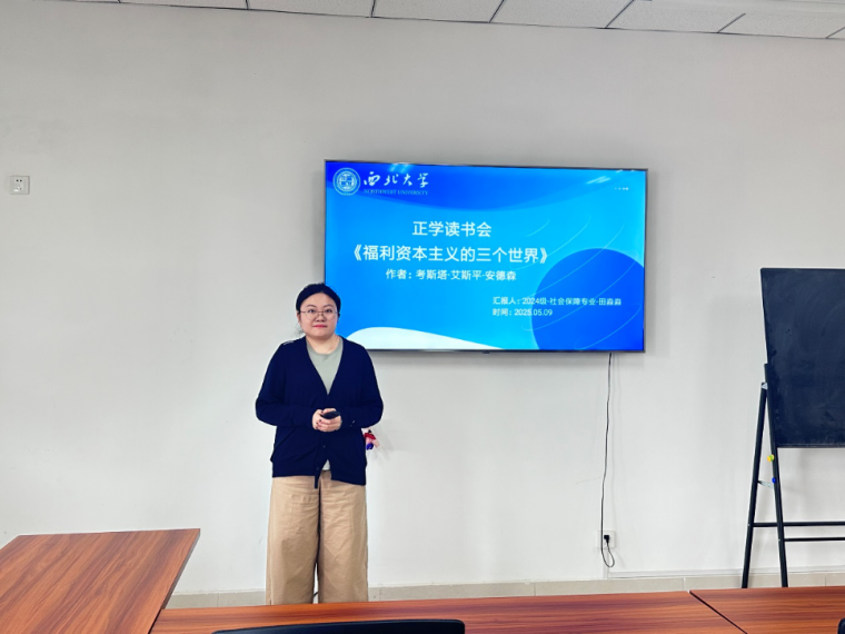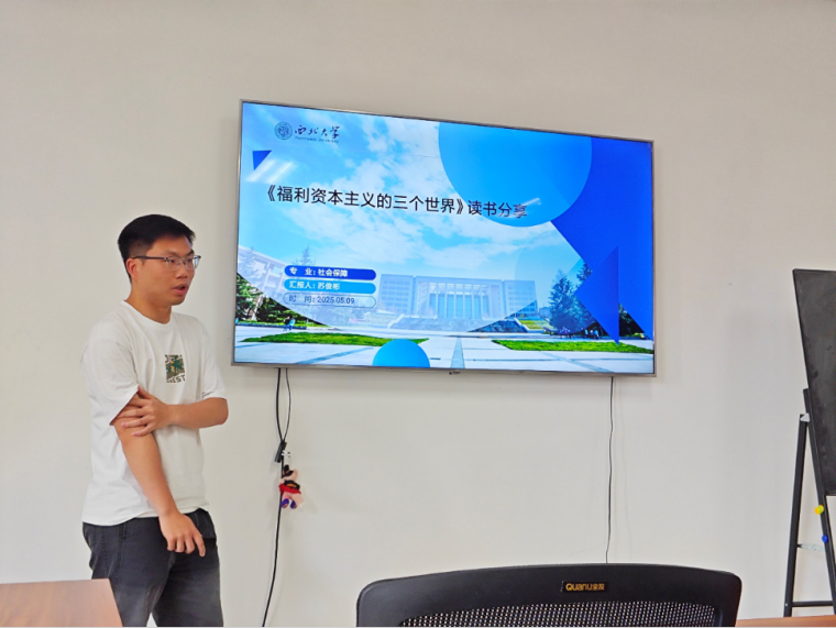 2024级行社会保障专业硕士研究生田淼淼分享的书籍是考斯塔·艾斯平·安德森《福利资本主义的三个世界》。该同学详细介绍了作者艾斯平·安德森在社会政策研究领域的深厚造诣,点明该书作为福利国家理论研究经典著作的重要地位。在阐述选题缘由时,田淼淼同学从理论创新、历史解释力、学科融合三个维度展开,指出书中以“去商品化”为核心的福利体制类型学,打破传统研究范式;对欧美国家福利体制形成的溯源剖析,展现强大的历史解释力;跨学科研究方法更为社会保障研究提供全新路径。随后,田淼淼同学系统梳理书籍核心内容。以劳动力去商品化程度为标尺,结合美、德、瑞等典型国家案例,深入阐释自由主义、保守主义、社会民主主义三种福利体制的特征差异,并从政治、历史、经济多视角剖析福利体制形成机制。在理论价值与局限探讨中,汇报既肯定其类型学构建、本质洞察等理论贡献,也客观指出地域覆盖局限、动态分析不足等问题。最后,田淼淼同学结合中国国情,提出在比较研究、责任平衡、理论本土化等方面的启示。