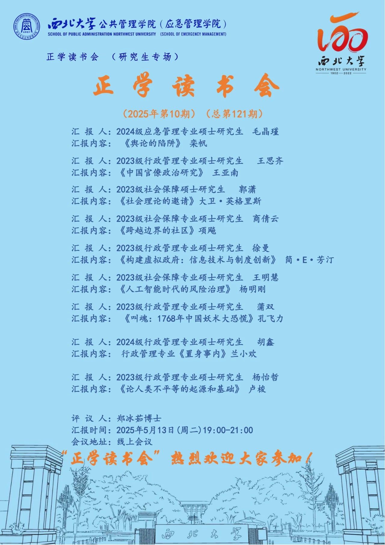 2025年5月13日,我院举办了2025年第10期正学读书会。西北大学公共管理学院2024级应急管理专业硕士研究生毛晶瑾、2023级行政管理专业硕士研究生王思齐、2023级社会保障硕士研究生郭潇、2023级社会保障专业硕士研究生商倩云、2023级行政管理专业硕士研究生徐曼、2023级社会保障专业硕士研究生王明慧、2023级行政管理专业硕士研究生蒲双、2024级行政管理专业硕士研究生胡鑫、2023级行政管理专业硕士研究生杨怡哲分别作为主讲人进行读书汇报,公共管理学院2024级博士研究生郑冰茹担任评议人,部分研究生旁听了此次报告会。