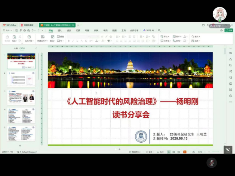 2023年社会保障专业硕士研究生分享了杨明刚的《人工智能时代的风险治理》,她从作者简介、大体内容、读后评价三个方面进行阐述。首先,王明慧简要介绍了作者杨明刚的学术背景和社会职务,随后详细梳理了书中的核心内容。她指出,该书从传统社会面临的自然风险、人为灾害风险入手,逐步过渡到现代社会由于科技发展所衍生的各类新型风险,特别是人工智能带来的算法风险、数据安全风险、就业结构风险、伦理道德风险、网络安全威胁以及信息安全风险等。针对这些风险,王明慧同学还介绍了书中提出的一系列全面且系统的治理策略。这些策略涵盖了建立现代风险前置研判及重大决策风险分析机制、完善法律法规与监管体系、加强技术创新与安全防护、推动国际合作与交流等多个维度。最后,她从评判性评价和意义两个方面进行总结和分享,并结合自身专业谈了几点感触。