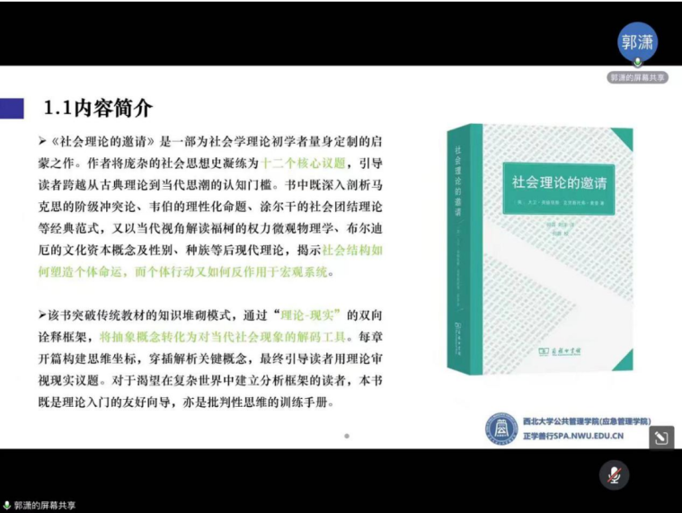 2023级社会保障专业研究生郭潇分享书目是大卫•英格里斯所著的《社会理论的邀请》。郭潇同学从书籍简介、书籍脉络、内容分享、思考和讨论四部分展开她的分享。她系统梳理了社会理论的发展脉络,从古典理论到当代思潮,通过解析社会理论的核心范式与当代价值,探讨社会结构如何塑造个体命运,而个体行动又如何反作用于宏观系统这一命题。在内容分享部分,她重点剖析了贯穿几乎所有社会理论的三大关键主题:知识(本体论与认识论的互动)、结构与行动(能动性)以及现代性。郭潇同学从社会思想中的古典传统展开,阐述了康德、黑格尔、韦伯、尼采等人的理论及其对后续社会理论的影响,并以功能主义范式、理性选择与交换理论范式为例,细致对比了两者对“社会秩序”的不同解释路径。她认为理论选择隐含价值偏向,功能主义中社会是功能整合的系统,整体优先于部分,个体扮演被结构形塑的“文化傀儡”;而理性选择理论则可能弱化文化共识,现代社会是理性化、市场化的场域,个体通过契约和交换实现合作,是自主决策的“理性行动者”。最后提出对社会理论“反身性”的价值应用、警惕西方中心主义的叙事局限、关注其中性别、种族等多元身份的缺位等的进一步思考。