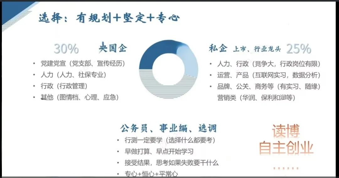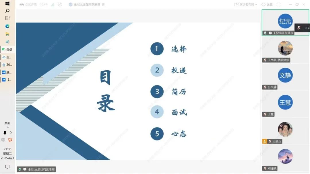 会议伊始,王纪元学姐进行了简单的自我介绍,分享其最终拿到的心仪offer的心路历程。王纪元同学从选择、投递、简历、面试和心态五个方面展开经验分享。